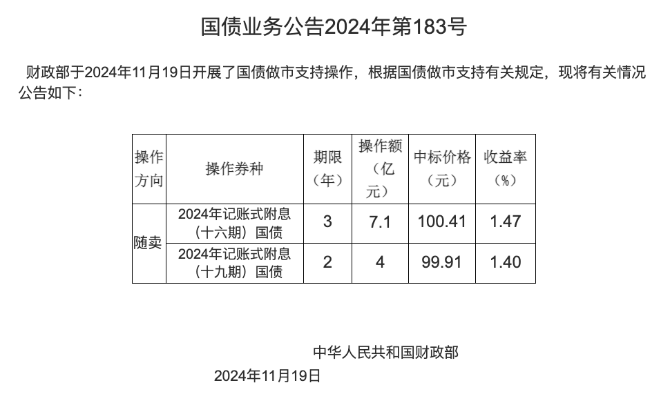 本报讯 (记者韩昱)财政部11月19日发布的《国债业务公告2024年第183号》显示,财政部于2024年11月19日开展了国债做市支持操作,操作券种为2024年记账式附息(十六期)国债、2024年记账式附息(十九期)国债;期限分别为3年、2年;操作额分别为7.1亿元、4亿元;操作方向均为随卖。