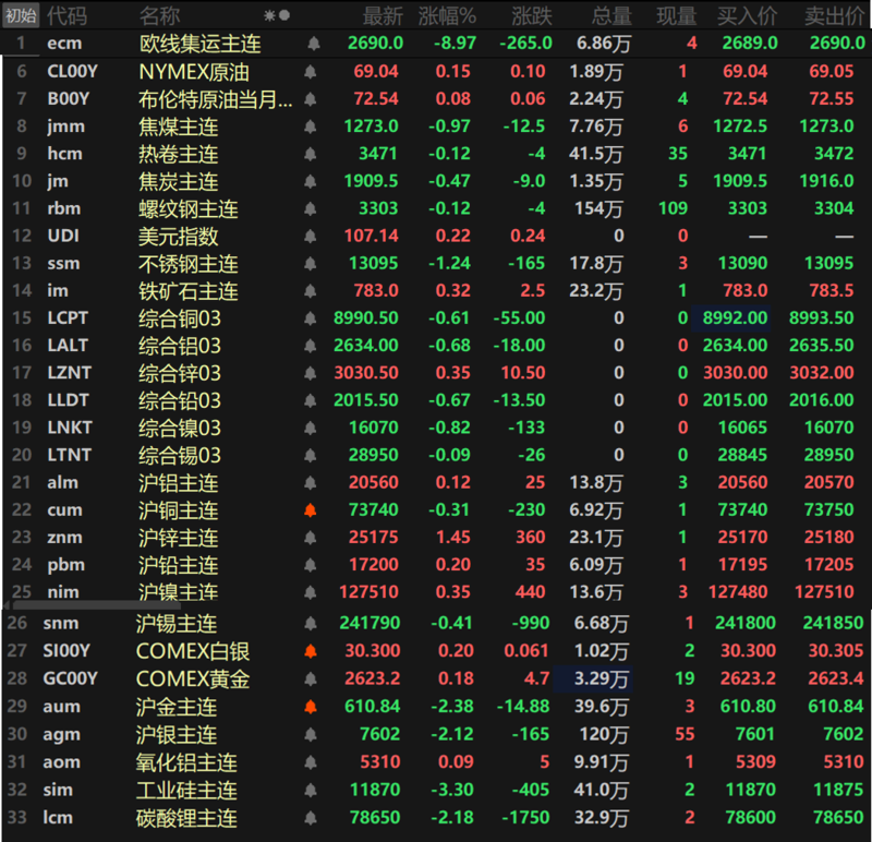 碳酸锂主连跌2.18%,工业硅主连跌3.3%,录得三连跌。欧线集运主连大跌8.97%。