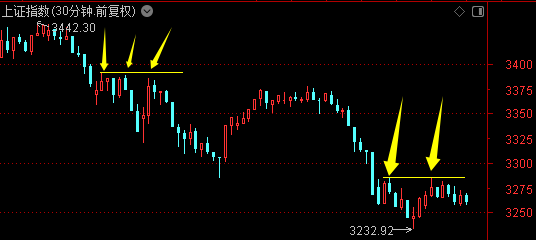 上证指数的30分钟K线图上,有个细节要注意。昨天最高点是3285.46点,今天的最高点是3285.33点,距离突破仅差一点点。
