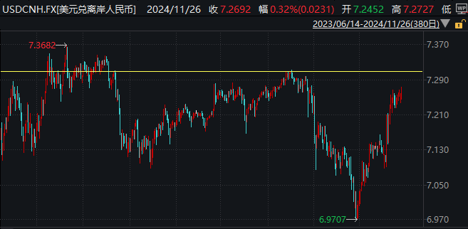 今天,离岸人民币兑美元汇率创下本轮以来的新低。从9月下旬以来的6.97附近,下跌至今天的7.26附近。