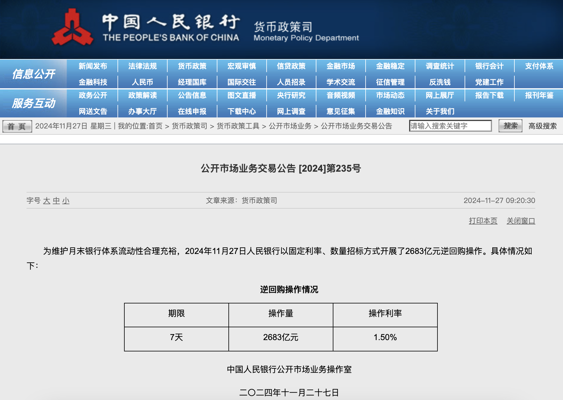 证券时报网讯,据央行网站消息,为维护月末银行体系流动性合理充裕,2024年11月27日人民银行以固定利率、数量招标方式开展了2683亿元7天期逆回购操作。操作利率1.5%,与此前持平。