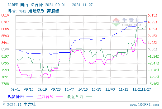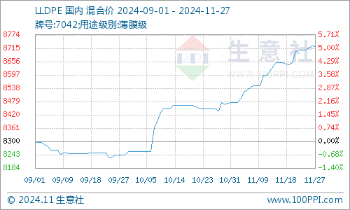 据生意社商品行情分析系统监测,LLDPE(7042)11月1日国内价格在8475元/吨,11月27日均价在8721元/吨,期间报价上涨2.91%。