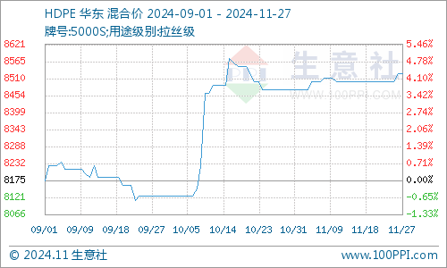 据生意社商品行情分析系统监测,HDPE(2426H)11月1日国内价格在8475元/吨,11月27日均价在8525元/吨,期间报价上涨0.59%。