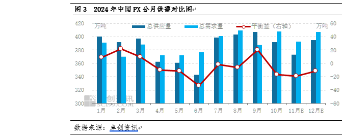 得益于中国PTA新产能的集中扩张,从而推动了PX的消费增长,2024年PX总消费量预计为4675万吨,同比增幅高达12.62%。从月度消费情况来看,2月份总消费量为370万吨,处于年内谷值,因PTA新增产能兑现进展不及预期,且春节影响部分聚酯需求能力收窄,进而导致PX月度消费量降幅明显;8月份总消费量为410万吨,为年内峰值,因PTA的加工费用保持在合理的区间内,增强工厂方面生产积极性,进而带动原料需求提升。