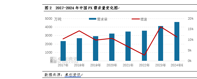 PX的下游应用中,PTA占比高达99.5%,形成一种近乎单一的上下游关系。中国的PTA行业是处于一个高速增长的时期,产能复合增长率达到14.18%,对PX需求量复合增长率在12.49%。其中第一轮产能扩张期为2010-2014年,经过市场的升级优化后,于2020年正式进入第二轮新增产能扩张期,并且这一趋势延续至今。