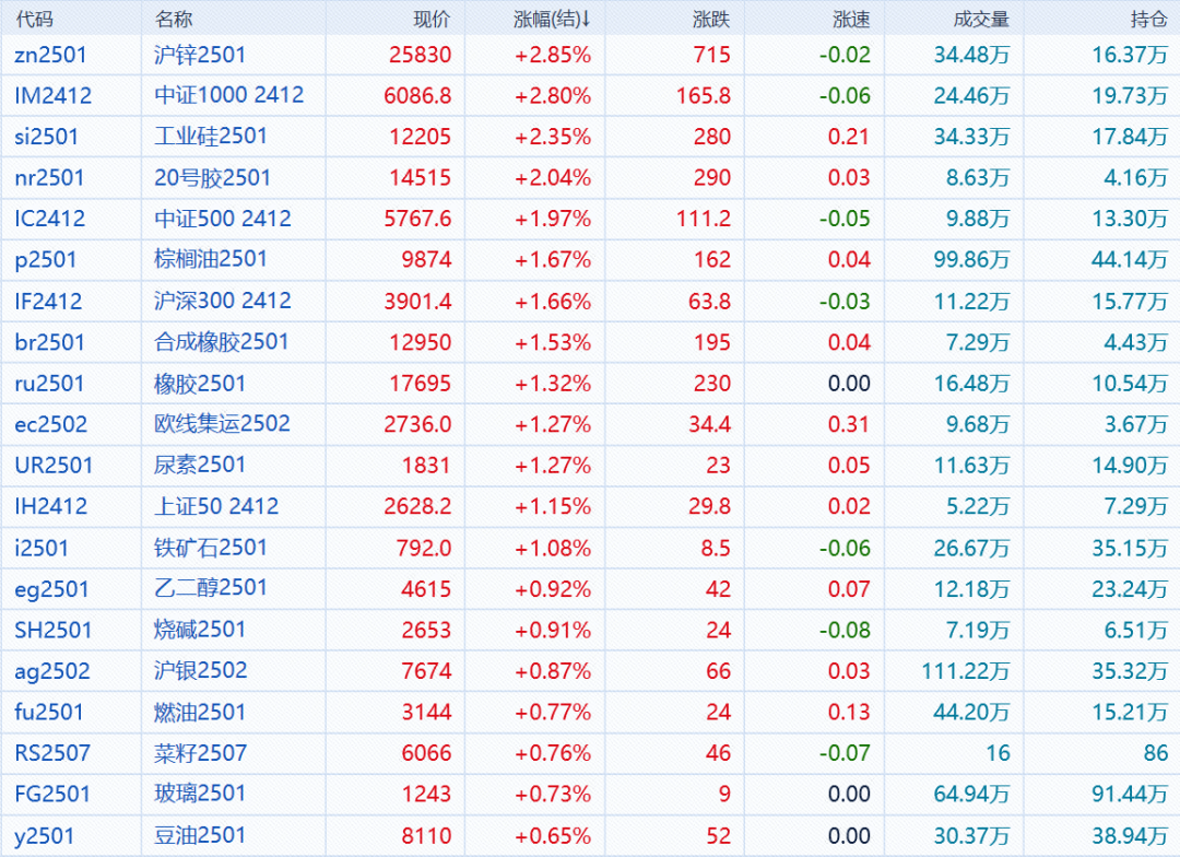 沪深300股指期货(IF)主力合约涨1.66%,上证50股指期货(IH)主力合约涨1.15%,中证500股指期货(IC)主力合约涨1.97%,中证1000股指期货(IM)主力合约涨2.80%。