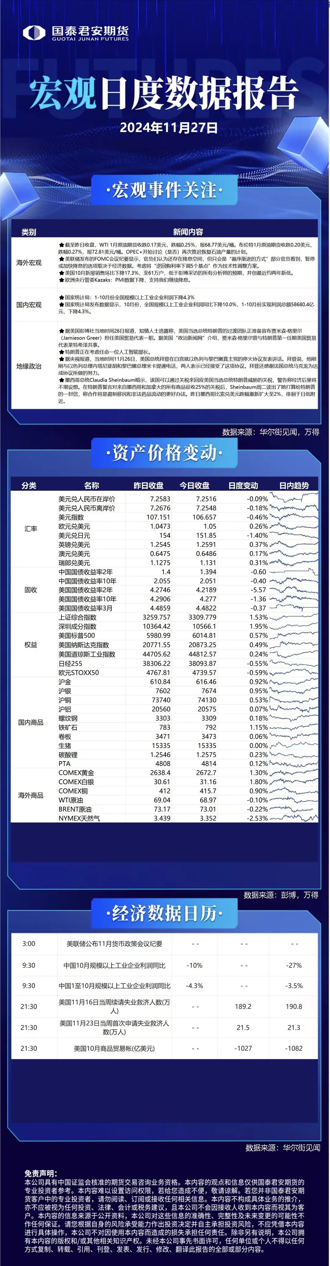 今日重点关注:锡。美国10月核心PCE物价指数同比2.8%,支持美联储降息的谨慎态度