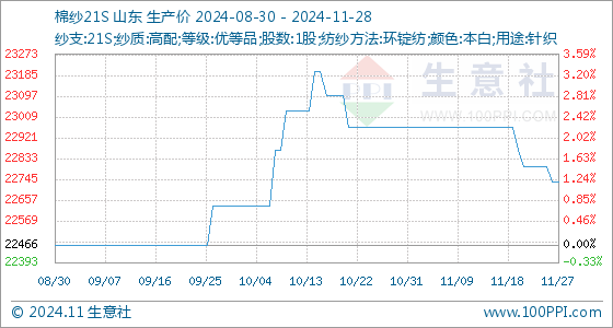 11月28日生意社棉纱21S基准价为22733.33元/吨
