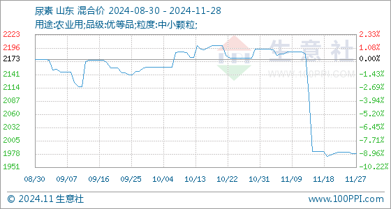 11月28日,生意社尿素基准价为1978.75元/吨,与本月初(2195.00元/吨)相比,下降了-9.85%。