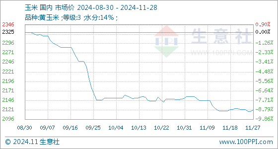 11月28日,生意社玉米基准价为2120.00元/吨,与本月初(2151.43元/吨)相比,下降了-1.46%。