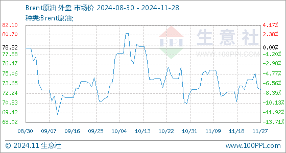 11月28日生意社Brent原油基准价为72.81美元/桶