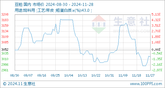 11月28日,生意社豆粕基准价为3022.00元/吨,与本月初(3034.00元/吨)相比,下降了-0.40%。
