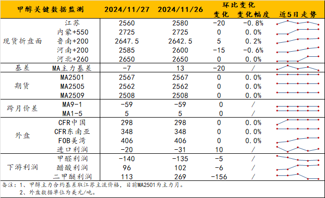 逻辑:港口基差波动不大,维持01-25左右;内地涨势暂缓,华东周边、华中等局部回落。逻辑上,不论伊朗装置因何检修,都将在年末造成“限气停车”的效果,而甲醇年末进口减量情况(即伊朗进口减量)将影响后市去库预期,这些得在MA2505上才能看到结果。利多预期无法在MA2505初期证伪,故远月估值跟涨近月幅度虽有限,但未来下跌空间也将有限,而近月将随情绪退潮、持仓下降而回落。基本面上则呈现出多空交织,内地近期有局部检修、烯烃阶段性外采需求支撑,库存去化顺利,但鲁北招标价是否能维持高位待定、后期排库压力变化仍需关注。观点上,不建议追高近月,防回落,多头宜考虑远月;关注伊朗装置动态、宝丰四期动态(一条产线已落地)。