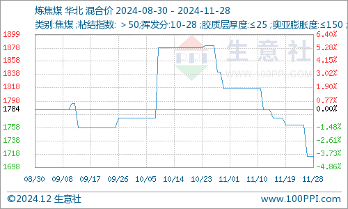 11月炼焦煤市场价格延续走跌之态,市场交投氛围冷淡,炼焦煤弱势整理为主。下游钢材市场进入淡季,黑色系进入下行走跌局势,钢材现货价格回落,受其影响,焦煤市场价格出现下跌走势。据生意社监测系统显示,截止11月28日,生意社炼焦煤价格指数在1714.75元/吨,较月初下降-5.64%。