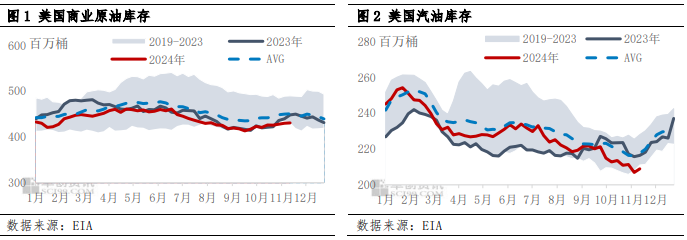 截至11月22日当周,美国商业原油库存较10月25日当周增加了293.9万桶,而汽油库存较则增加了137.3万桶,需求淡季区间叠加秋检结束后,炼厂开工率加速回升,商业原油和汽油库存呈现累库态势。但与同期水平相对比,美国原油和汽油库存处于近五年历史同期低位水平,低库存对油价显现支撑。整体库存水平对油价影响中性偏空。