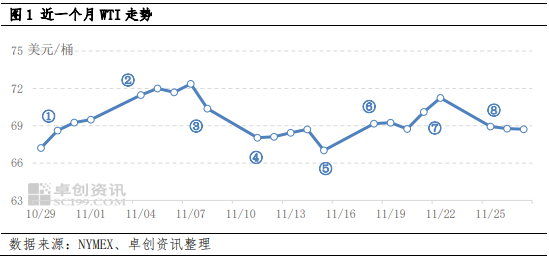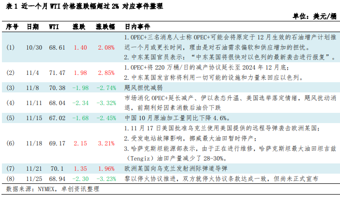 2024年11月,国际原油价格呈现“N”型走势,仍旧延续宽幅震荡态势,但波动幅度较前两个月有所收敛。截至11月27日周盘,本月美国原油月均价69.61美元/桶,环比下降2.64%,同比下跌10.04%;布伦特原油月均价73.35美元/桶,较上月下跌2.6%,较去年同期同比下跌10.58%。根据整体11月驱动油价变动较大幅度的事件整理(图1和表1),可以发现11月市场受宏观、地缘和供应扰动因素影响明显,多空交织,走势震荡。