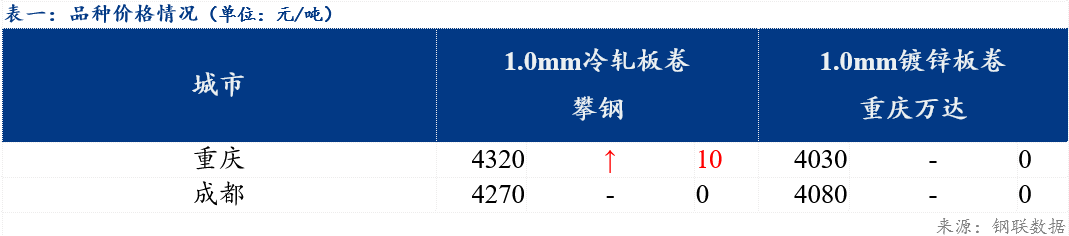 具体来看,冷轧方面:重庆市场冷轧现货价格上涨10元/吨,市场交投氛围尚可。由于终端增量过后,钢厂主要以保供终端用户为主,市场流通资源投放速度放缓,市场整体资源表现相对紧张。现阶段,市场库存压力明显下降,贸易商心态表现尚可。在成本及库存的双重助力下,贸易商挺价意愿偏强,部分规格价差扩大。镀锌方面:当前西南市场需求依旧较为疲软,在供应也偏紧的状态下, 市场处于供需双弱的情况中,因此价格暂稳。