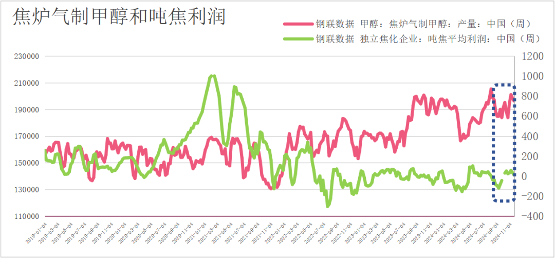 供给端扰动逐渐弱化:供应端甲醇周度产量维持在185万吨之上,主要的贡献量是煤制甲醇产量的大幅上行、焦炭利润逐渐恢复,焦炉气制甲醇产量高位运行、冬季甲醇检修下降,上述三重原因使得甲醇今年的产量高于往年同期水平。需求端MTO装置维持较高的开工,传统需求今年表现较好,供需维持紧平衡状态。