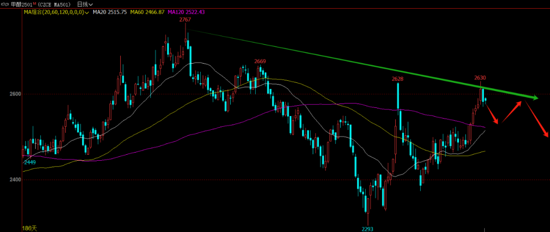 回归甲醇目前的价格和趋势已经计价了大部分供应端的扰动(国外开工降至低位+国内气头装置开始停车),需求端并未计价需求淡季的预期(MTO装置开工依旧高位,传统需求依旧强劲)。价格目前运行至前高2628附近出现压力,通过上文详细的供需和估值逻辑演绎,供给端的利多基本计价完毕,需求端开工高位很难驱动价格进一步上行,估值端也有向下游让利,达到产业链健康发展的目的。综上所述,甲醇2501合约或将在前期高点2628作为之后价格运行的高点,震荡偏弱运行为主;套利方面PP-3MA可选在价差低于-350的时候,择机做多MTO利润;