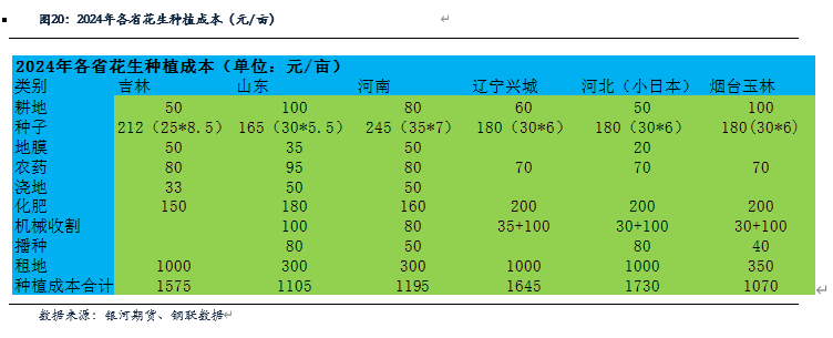 今年花生种植面积增加,但单产减少较多,整体预期今年花生产量和去年基本持平。根据我们去花生产地的调研,由于种植玉米收益较低,花生收益仍可观。2024年吉林地租下降,种植成本减少,2024年吉林的种植成本在1500元/亩左右。花生与大豆、玉米等农作物相比,收益可观。河南和山东产地,农户大部分是自有土地,种植成本基本在500-700元/亩,花生米亩产在400斤左右,即使按照4.0元/斤计算,花生收益也高于玉米。目前市场反应,今年玉米价格继续下跌,河南等地种植花生意愿仍较高。