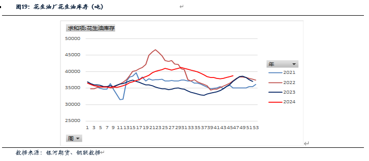 最近由于油脂整体偏强,花生油厂花生油库存处于高位,花生油与豆油价差开始扩大,花生油消费仍较弱。截止11月27日一级花生油价格为14400元/吨,较上个月上涨600元/吨,浓香型为17000元/吨,价格比上月上涨300元/吨。截止11月22日,根据钢联统计,花生油样本企业花生油库存为3.90万吨,库存高于上月的3.80万吨,仍处于过去几年高位。11月油厂仍会陆续收购,随着花生油厂开机率的增加,花生油库存仍会上涨。