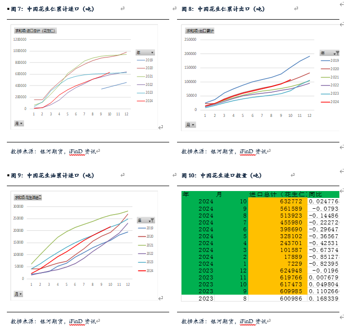 2024年10月花生仁进口7.1万吨,高于去年0.75万吨,其中苏丹进口6.8万吨,塞内加尔进口0.05万吨,1-10月花生进口总量63.3万吨,高于去年同期2.5%。1-10月累计出口花生仁10.8万吨,同比增57%。今年允许尼日利亚进口花生,该国产量450万吨,远超塞内和苏丹,预计进口量后期会增加。进口苏丹花生价格在7600元/吨,比11月初有所上涨。