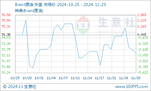 国际原油市场,中东地缘问题缓解,原油价格微幅下跌,对PTA成本支撑放缓,截止11月26日,美国WTI原油期货主力合约结算价报68.77美元/桶,布伦特原油期货主力合约结算价报72.81美元/桶。