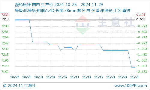 据生意社商品行情分析系统,11月中旬开始国内涤纶短纤市场行情出现小幅回落,截止11月28日江浙主流工厂1.4D*38mm均价在7176元/吨,较11月12日下跌0.92%。成本震荡走弱,对涤纶短纤成本支撑不足,自身流通货源充足,下游需求相对清淡,供需面转弱,导致短纤价格震荡下跌。