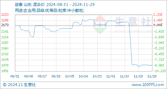11月29日,生意社尿素基准价为1981.25元/吨,与本月初(2195.00元/吨)相比,下降了-9.74%。