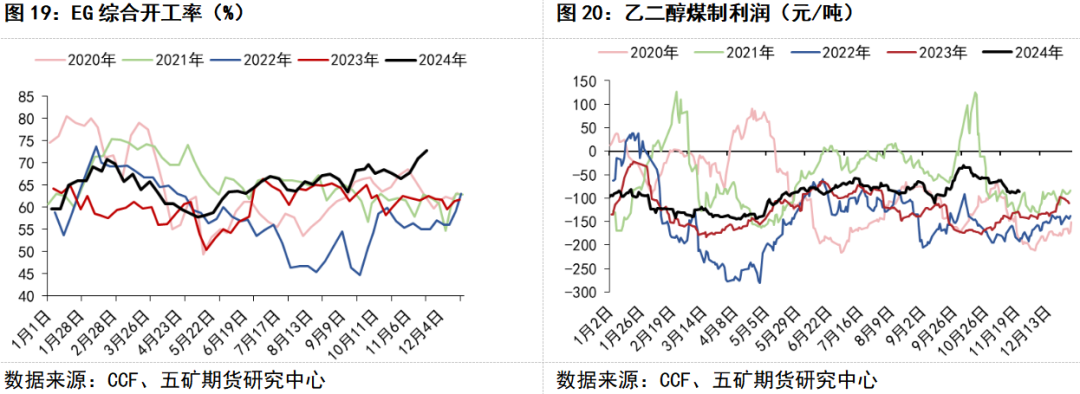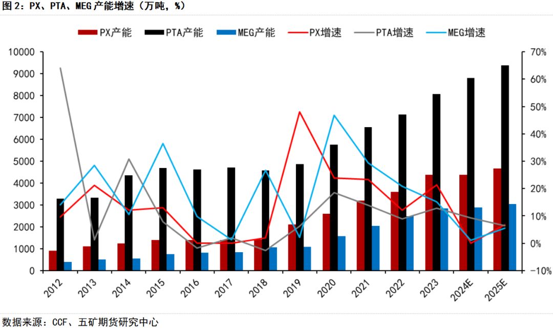 从产能周期来看,2019年MEG为投产真空期,而PX-PTA则进入三年供给侧改革后的大投产时代,PX装置率先落地,在2019年产能增速接近50%,PXN从2018年的高点大幅压缩,此阶段MEG相对走强。2020-2023年聚酯原料均处于产能快速增长阶段,供需格局逐渐走向过剩,此阶段的主要矛盾从产能周期转移至动力煤及调油等扰动。2024年乙二醇投产再度下滑至低点,PX-PTA产业链中,PX国内也无新增产能,但乙二醇供需格局的改善及亚洲芳烃过剩共同推动价差走弱。