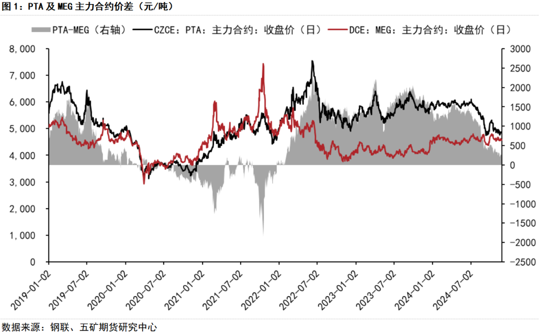 2024年:此阶段PTA-MEG价差从1500元左右的高位压缩至200元以内。芳烃调油的行情在支撑了两年亚洲芳烃估值后,今年下半年悉数回吐,美国炼厂对于调油需求有准备,且经历了22-23年亚洲装置大检修后,24年亚洲PX的检修量相对较少,纯苯带来的高利润支撑亚洲重整和歧化开工,美国汽油表现较差的情况下,随着8月美韩芳烃贸易的结束,原料从调油端回流至化工端,最终亚洲在供给压力上升的情况下估值中枢下移,伴随着原油趋势性下跌,PTA价格大幅下跌。MEG在2024年因产能投产与下游错配,全年产能仅小幅增长,阶段性结束了大投产周期,同样是低利润低开工下,叠加海外因巴拿马运河、红海事件进口阶段性下滑,MEG港口大幅去库,共同推升了此轮MEG估值中枢的上移。于是PTA-MEG的价差在两者估值的不同周期里压缩。