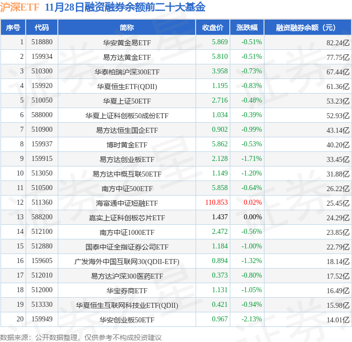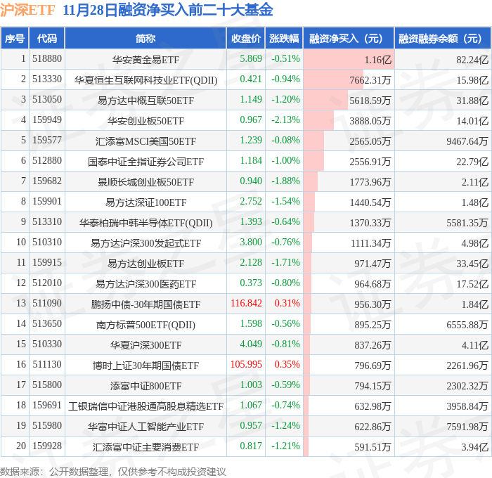 11月28日沪深ETF融资净买入排行榜:华安黄金易ETF融资净买入居首