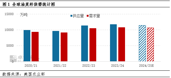 2024年中国、欧盟、澳大利亚、加拿大等重要油菜籽种植国家油菜籽产量纷纷下降,导致全球油菜籽产量减少。据美国农业部数据显示,2024/25年度全球油菜籽产量在8724万吨,较上一年度同比减少2.95%。随着产量下降,2024/25年度全球油菜籽供应量将下降至1.1415亿吨,较上一年度同比减少2.64%。供应量下降,下游市场油菜籽需求量同样减少。2024/25年度全球油菜籽需求量为1.061亿吨,较上一年度同比减少0.96%。由于需求量减幅相对较小,导致油菜籽期末库存量下降至805万吨,较上一年度减少20.38%,因此2024/25年度全球油菜籽供需格局由宽松变为紧张。