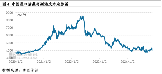 据加拿大农业部数据显示,2023/24年度加拿大油菜籽出口量在668.3万吨,其中出口到中国的数量为438.81万吨,占比为65.66%。随着中国油厂对加拿大油菜籽采购量下降,加拿大国内油菜籽消化速度放缓,价格将有所下调,导致国内进口油菜籽到港成本减少。