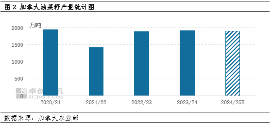 国内油菜籽进口依存度较高,进口油菜籽的主要来源国为加拿大,2024/25年度加拿大油菜籽产量同样下降,据加拿大农业部数据显示,2024/25年度加拿大油菜籽产量在1898.1万吨,较上一年度同比减少1.10%。中国商务局对加拿大进口油菜籽正在进行反倾销调查,虽然近期中加贸易关系缓和的消息频出,但是在中国商务部公布调查结果之前,国内油厂依然不会贸然大量进口加拿大油菜籽,因此2025年国内油菜籽进口量将明显减少。