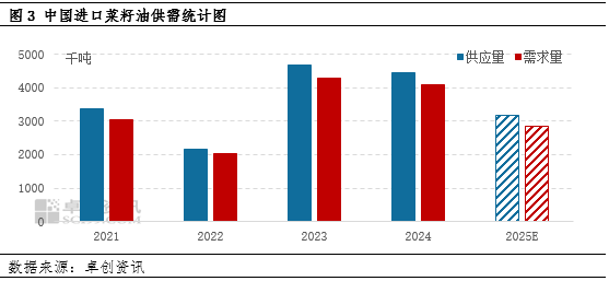 随着产量下降,预计2025年国内进口菜籽油供应量为317.1万吨,较2024年同比减少28.76%。供应下降支撑价格上涨,下游市场对高价菜籽油需求量下降,预计2025年国内进口菜籽油需求量为286万吨,较2024年同比减少30.11%。