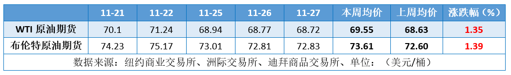 本周(11.21-11.27),原油整体呈现先涨后跌的走势,均价环比上涨。