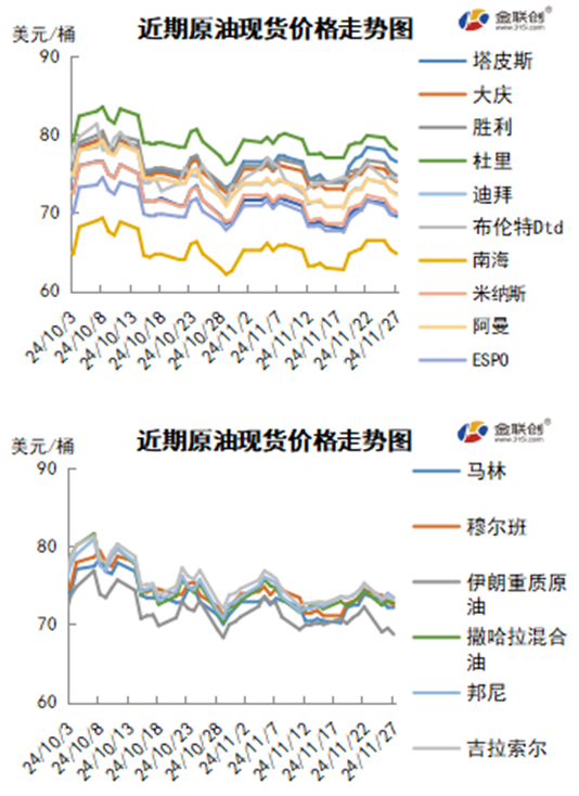 本周,国际原油现货均价环比上涨。中东原油市场方面,迪拜石油事务部26日表示,迪拜已将2025年2月迪拜原油的官方售价设定为2024年12月GME阿曼市场价格的平均价格。此外,阿塞拜疆能源部长Parviz Shahbazov表示,OPEC+可能会考虑在12月1日的会议上决定从明年1月1日开始继续维持目前的石油减产政策,该组织此前已在担忧需求的情况下推迟了增产。