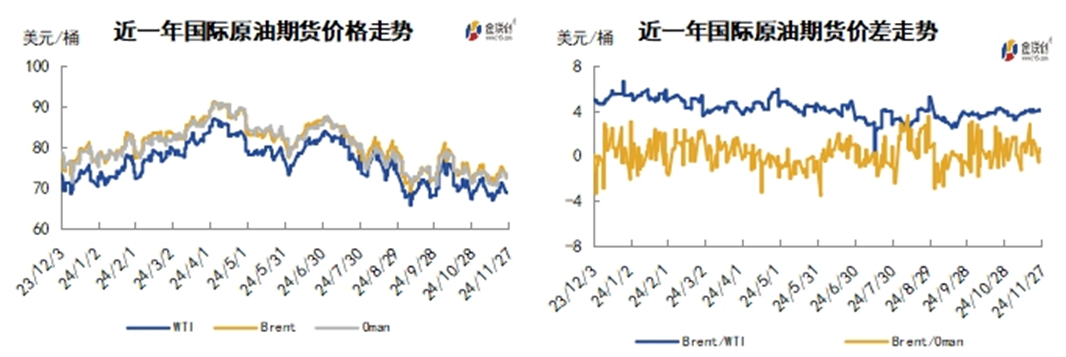 导言:本周(11.21-11.27),原油整体呈现先涨后跌的走势。WTI本周均价69.55美元/桶,较前一周上涨0.93美元/桶,或1.35%。周内,对油价起到支撑的主要因素有:俄乌地缘局势升温,美国原油库存减少以及OPEC+或将延长减产。另一方面,黎以达成停火协议,中东地缘局势缓和导致油价承压回落。