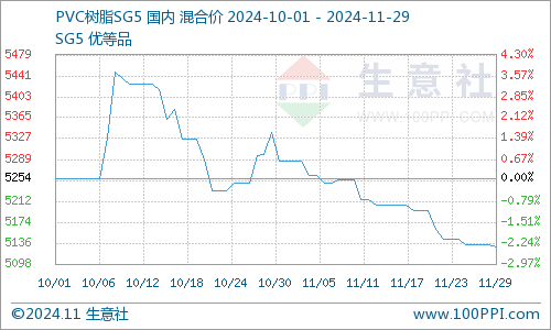 据生意社商品行情分析系统监测显示,本周(11.25-29)PVC现货市场延续上周跌势。截止周五,国内PVC电石法SG-5型均价5130元/吨,周内价格下跌1.27%。