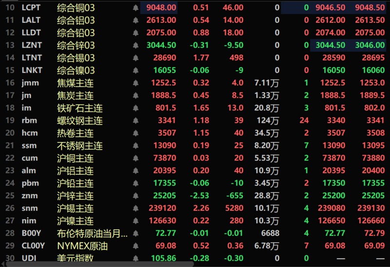 黑色系均飘红,铁矿涨1.65%。螺纹、热卷均涨超1%。不锈钢涨0.19%。双焦方面,焦煤涨0.32%,焦炭涨0.45%。