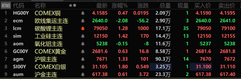 贵金属方面,截至11:45分,COMEX黄金涨0.63%;COMEX白银涨1.8%。国内方面,沪金涨0.61%,沪银涨1.33%。