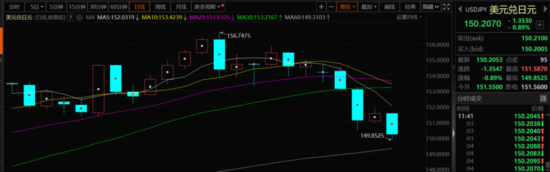 截至11月29日11:41分,美元兑日元跌0.89%,报150.2070,盘中最低触及149.8525。
