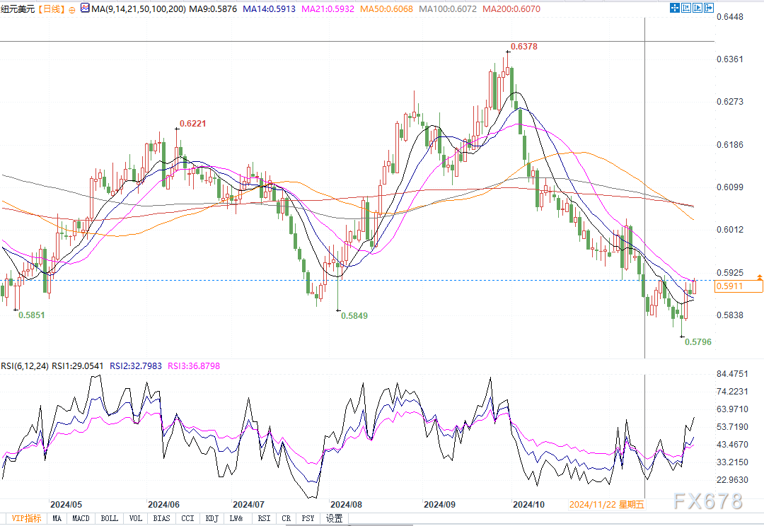 纽元逼近上行通道上限0.5920,若突破将进一步挑战0.60和0.6038