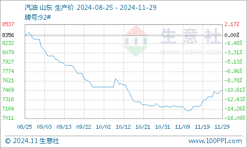 据生意社商品行情分析系统,11月地炼汽油价格行情走势上涨,柴油价格走势震荡为主,截止月末国内92#汽油价格为7482元/吨,月度价格上涨3.82%;国内0#柴油价格为6851.4元/吨,月度价格略涨0.30%。