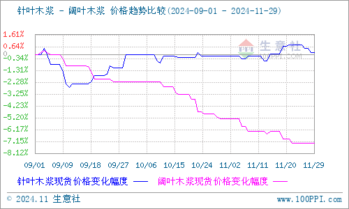据生意社商品行情分析系统监测:11月针叶木浆价格先扬后抑,阔叶木浆价格持续弱势下行。11月29日针叶木浆山东地区市场均价为6260元/吨,与11月1日均价相比上涨了0.32%。11月29日阔叶木浆山东地区市场均价为4542元/吨,与11月1日均价相比下降了2.11%。