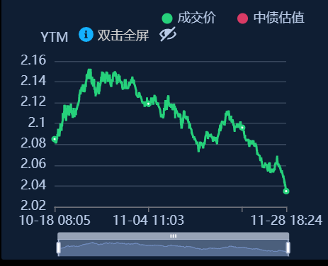 11月28日下午,债市行情大幅走牛。截至当日收盘时,10年期国债活跃券240011收益率下行2.85bp至2.0350%,创9月末行情以来的新一轮低位。当日30年期国债活跃券2400006收益率下行3.75bp至2.2125%。