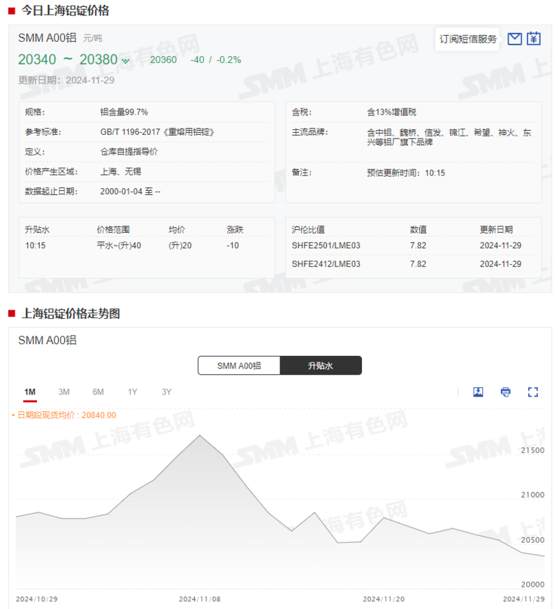 现货方面,据SMM现货报价显示,本周SMM A00铝现货报价整体呈现下跌态势,截至11月29日,SMM A00铝现货报价跌至20340~20380元/吨,均价报20360元/吨,较11月22日的20610元/吨下跌250元/吨,跌幅达1.23%。