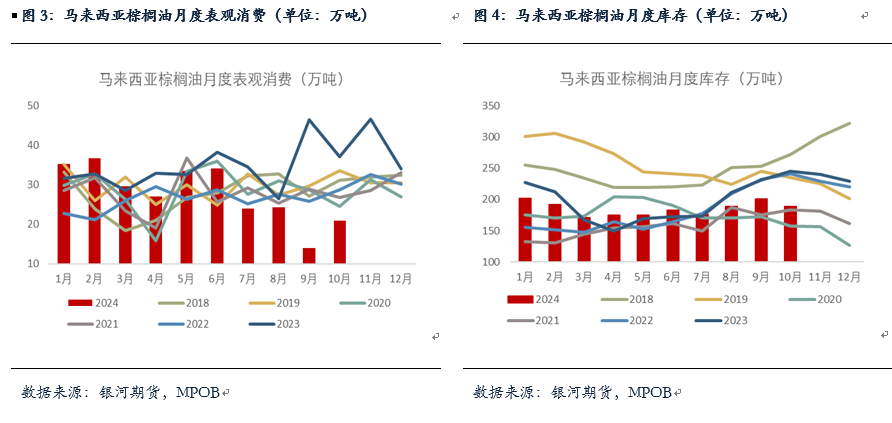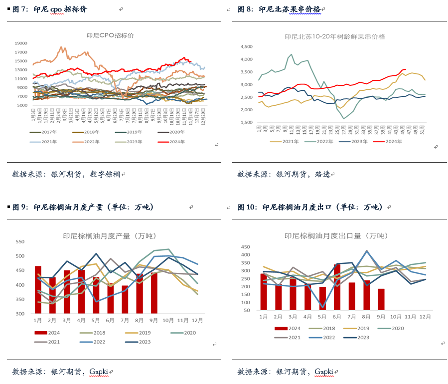 印尼方面,GAPKI数据显示印棕9月产量小幅增产至442万吨,与8月相差不大,而出口明显下降至历史同期低位,从8月的239万吨降至186万吨,国内消费量也从8月的206万吨略降至199万吨,今年印尼国内消费整体仍较为强劲,不过9月印尼月末库存累至302万吨,但仍处于偏低水平。从印尼果串价格来看,近期北苏和廖内果串价格仍在震荡上涨,与此同时印尼CPO招标价持续处于历史同期偏高水平,一定程度上反映出印尼产量和供应并不宽松。随着印尼也将进入减产季,后期产量也将继续下降。