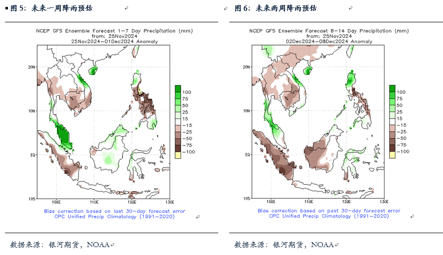 对于11月马棕产量及出口,MPOA对于11月前20日马棕产量的预估在-5.19%,UOB预计在-4%到不变的区间,而SPPOMA预计11月前25日马棕产量的减幅在3.24%,较前20日的减幅有所扩大。按照降雨预估图来看,未来一周马来降雨增多,尤其是马来半岛或将迎来强降雨,近期从新闻报道来看,产地部分地区已经出现洪水,高频数据预测的11月马棕产量减幅后期有望继续扩大,我们预计11月马棕产量或继续维持在170万吨附近。出口方面,ITS数据显示11月前25日马棕出口减少9%至120万吨,较前20日的减少5%减幅增加,从国别来看其中出口到中国的棕榈油增幅较为明显,出口到印度的棕榈油反而减幅较大,预计11月马棕出口将保持一个较为正常的水平。整体上,我们预计11月马棕月末库存或将小幅累库或持平,库存变动不大,供应仍较为偏紧。